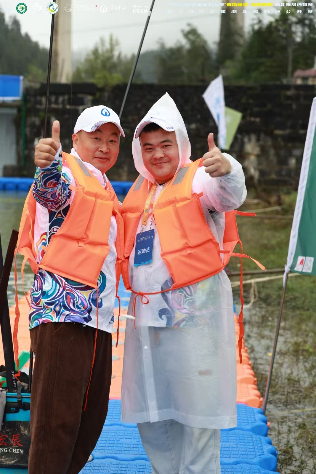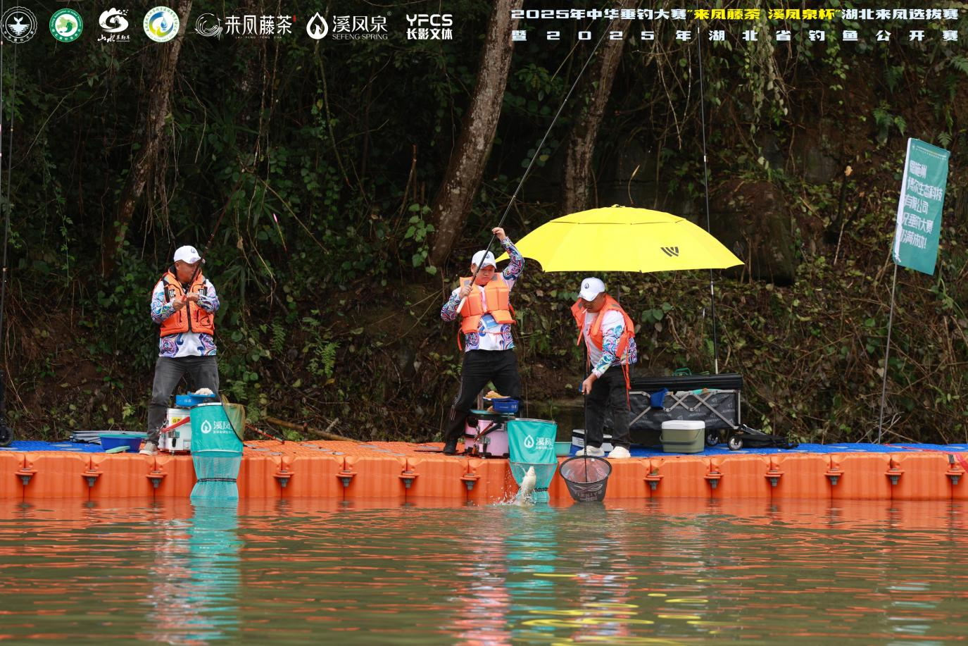 作为中国钓鱼运动协会(CAA)积分认证赛事,雨丝未减赛事专业底色。由湖北省钓鱼协会、恩施州体育局、来凤县人民政府联合主办,来凤县体育局、来凤县革勒车镇人民政府、 来凤县凤天水务投资建设有限责任公司承办,湖北长江电影文化体育产业有限公司运营的这场赛事,沿水库搭建的 600 米钓台被雨雾轻笼,靛蓝台体与澄澈湖面相映,成了山水间独特的竞技坐标。赛事采用 7.2 米以内手竿钓混合鱼团体重量积分赛制,两人执竿、一人协作,雨珠顺着竿梢滴落,溅起的水花与鱼漂的颤动共奏竞技旋律。
