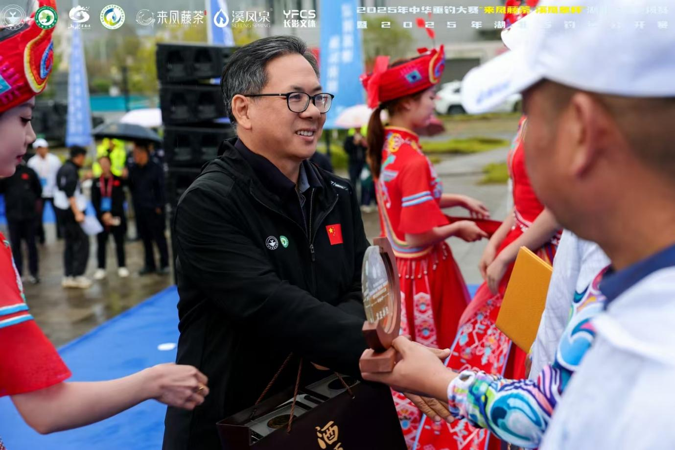 开幕式氛围感十足,土家摆手舞灵动起舞,发丝沾湿却不减热忱,悠扬旋律缠绕着远山近水。仪式由来凤县人民政府副县长汪玉明主持,县政协主席赵昌青在致辞中道出深意:“来凤三年钓赛升级国赛,这雨里的山水,既是对过往成果的延续,更是进一步践行“两山”理念、深入推进文体旅商农深度融合的重要举措。” 随着湖北省钓鱼协会会长孙全根宣布开幕,发令汽笛划破长空,五彩烟幕在翠峰间散开。